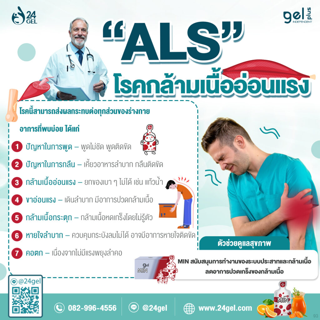 โรคกล้ามเนื้ออ่อนแรง หรือ ALS (Amyotrophic Lateral Sclerosis) เป็นโรคที่เกี่ยวข้องกับ ระบบประสาท โดยเกิดจากความผิดปกติของเซลล์ประสาทนำคำสั่ง ส่งผลให้กล้ามเนื้ออ่อนแรงลงเรื่อย ๆ จนกระทบต่อการใช้ชีวิตประจำวัน
