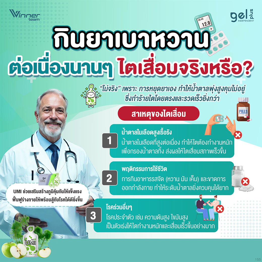 ดังนั้น การดูแลตนเองด้วยการควบคุมอาหาร ออกกำลังกาย และเสริมด้วยตัวช่วยดูแลสุขภาพ UMI ผลิตภัณฑ์อาหารเสริมรูปแบบเจลมีสารสกัดจากฟูคอยแดนจากสาหร่ายสีน้ำตาล ถือเป็นอีกทางเลือกที่ช่วยสนับสนุนการดูแลผู้ป่วยเบาหวานและลดภาระของไตได้ แถมยังช่วยเสริมสร้างภูมิคุ้มกันให้แก่ร่างกายได้