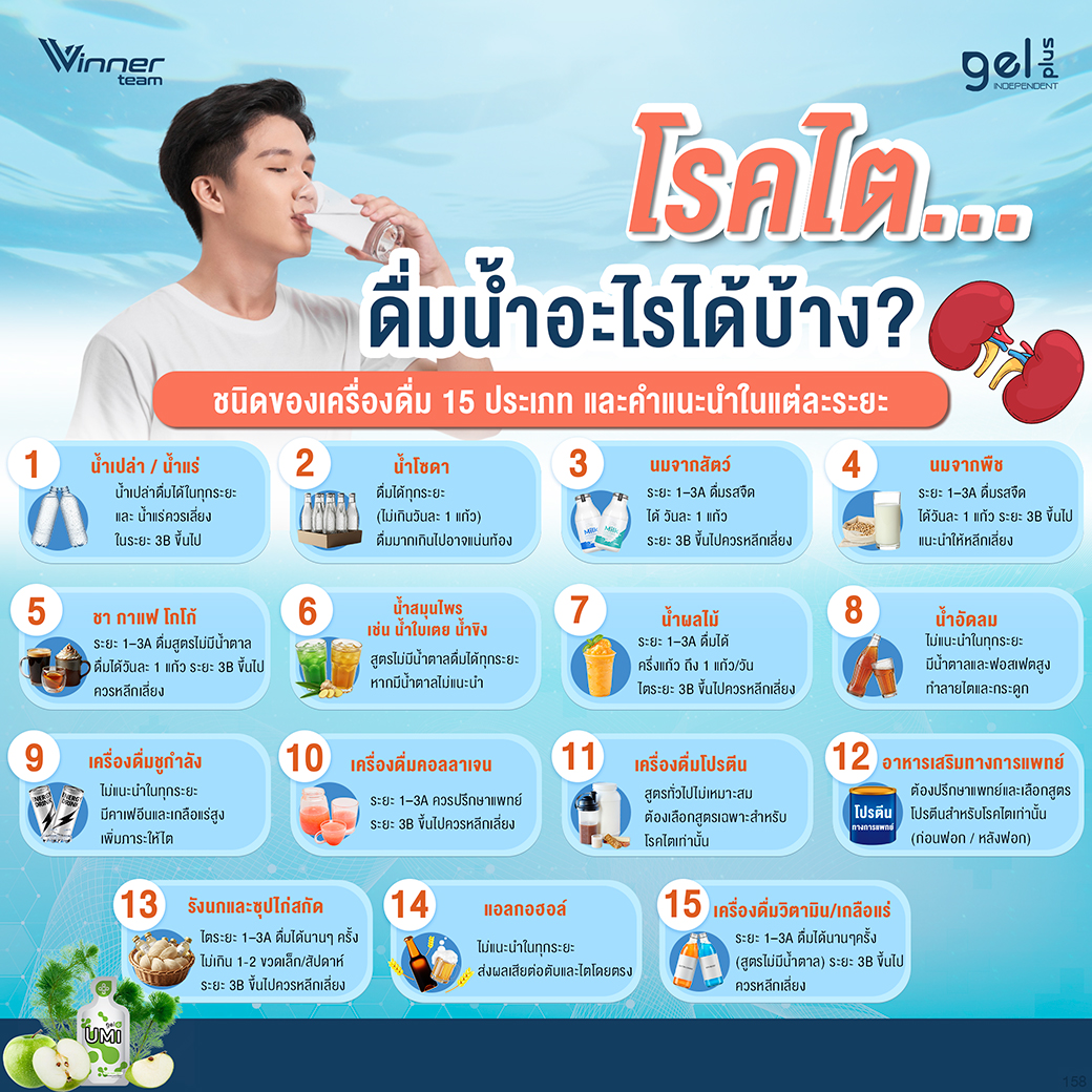 หากมีโรคร่วม เช่น เบาหวานหรือไขมันในเลือดสูง ควรเน้นดื่มน้ำเปล่าเป็นหลัก และหลีกเลี่ยงน้ำผลไม้หรือนมปรุงแต่ง เพราะน้ำตาลและไขมันสูงจะเร่งให้ไตเสื่อมเร็ว